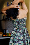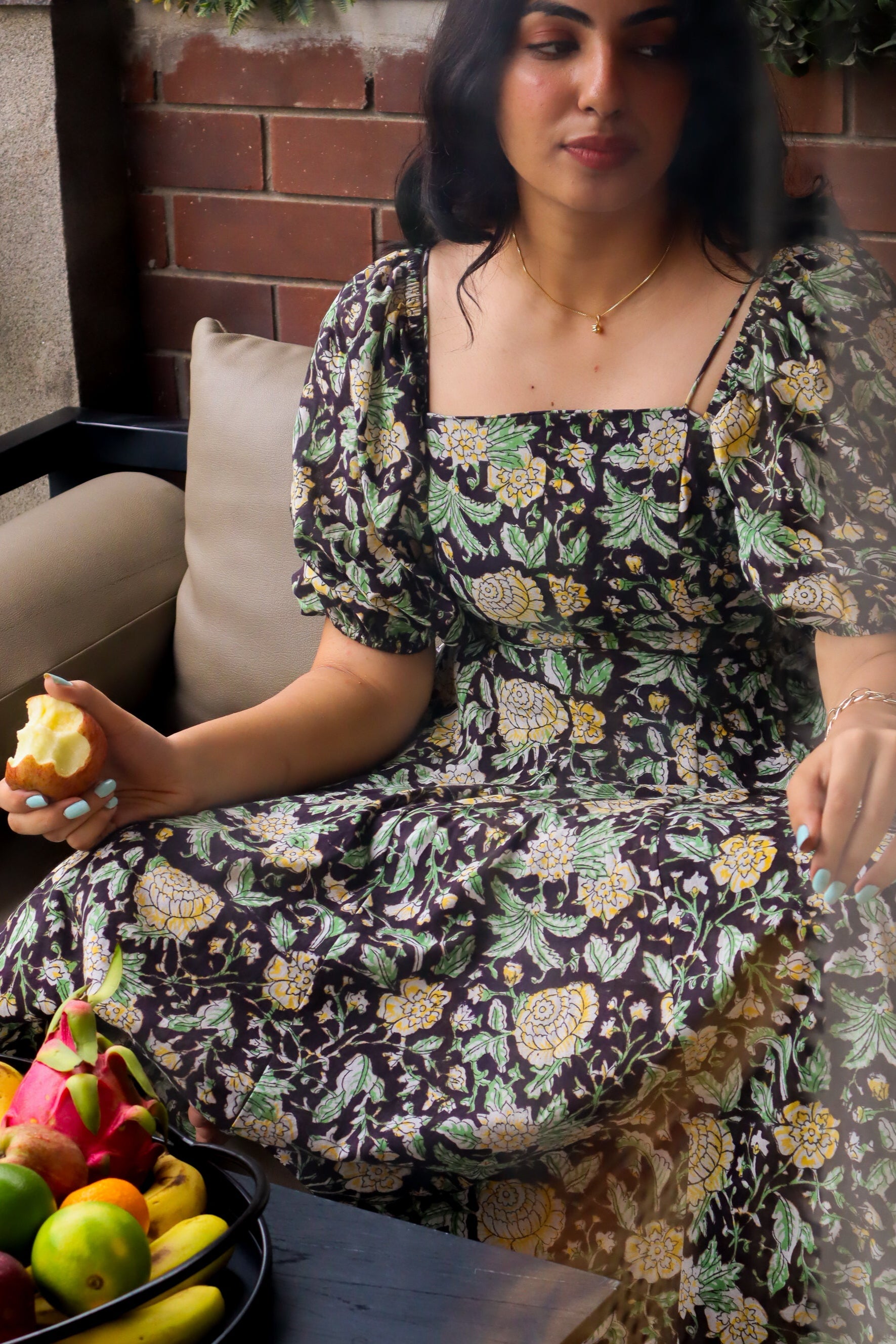 This versatile black floral dress offers a fit-and-flare silhouette, with corset strings at the back for a cinched waist. Featuring removable puff sleeves, it transforms seamlessly into a chic slip dress with spaghetti straps.
