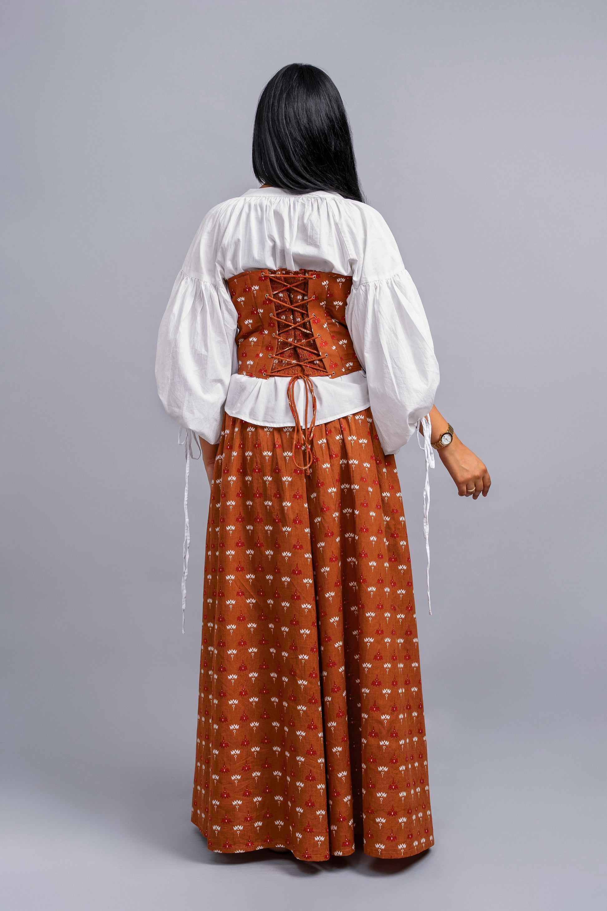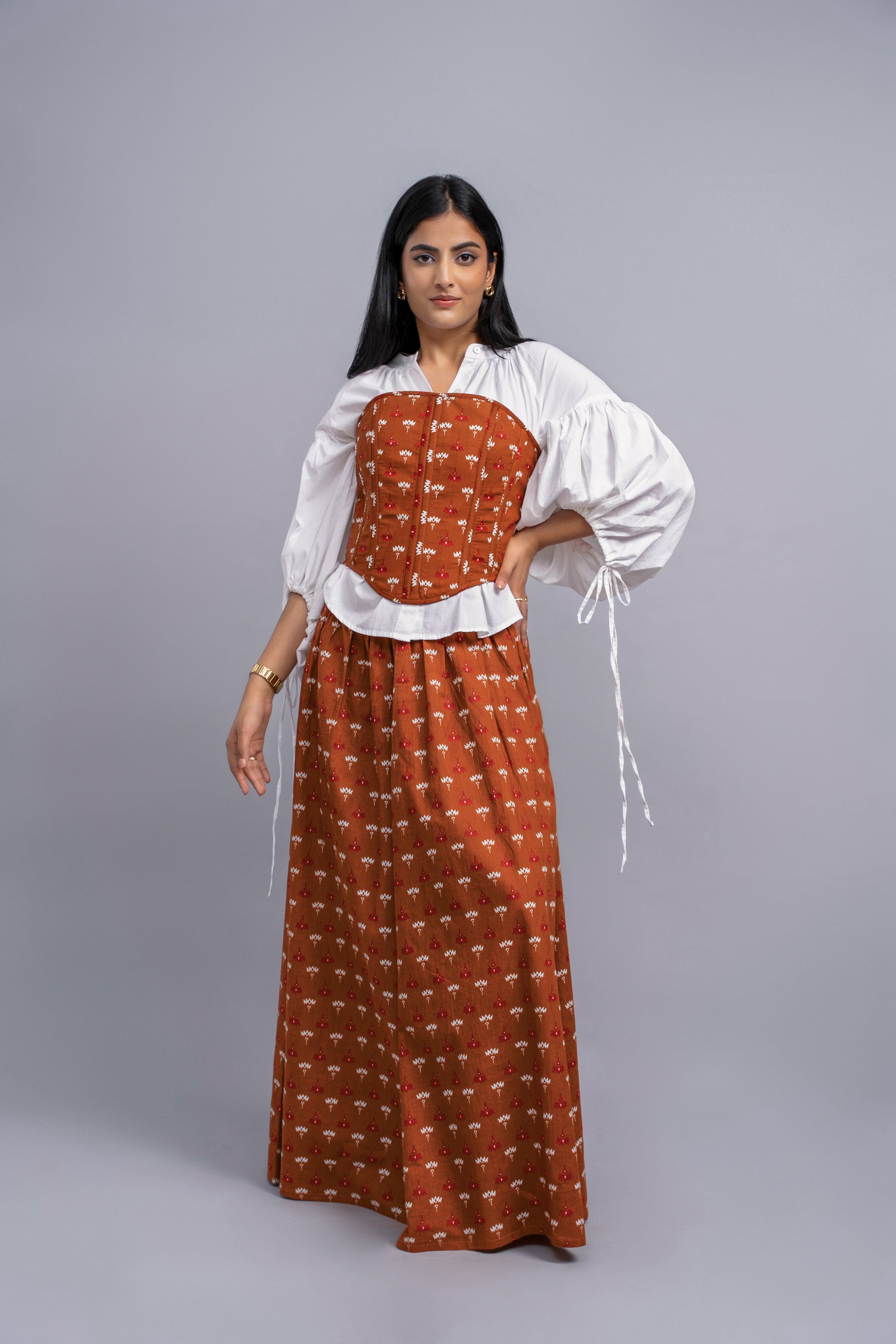 Tube corset top crafted in hand screen-printed cotton with a bold silhouette, featuring boning for structure and adjustable strings for a perfect fit. Perfect for evening outings or festive gatherings. Style it with high-waisted trousers or a flowy skirt for an elegant, on-trend look.