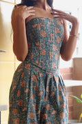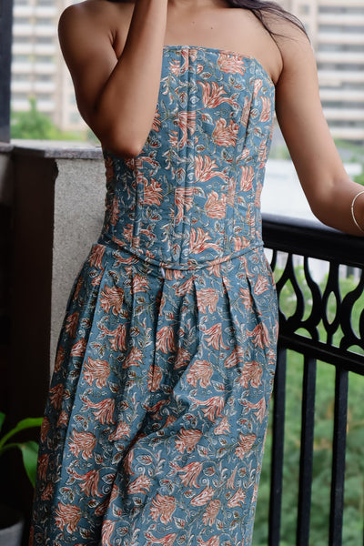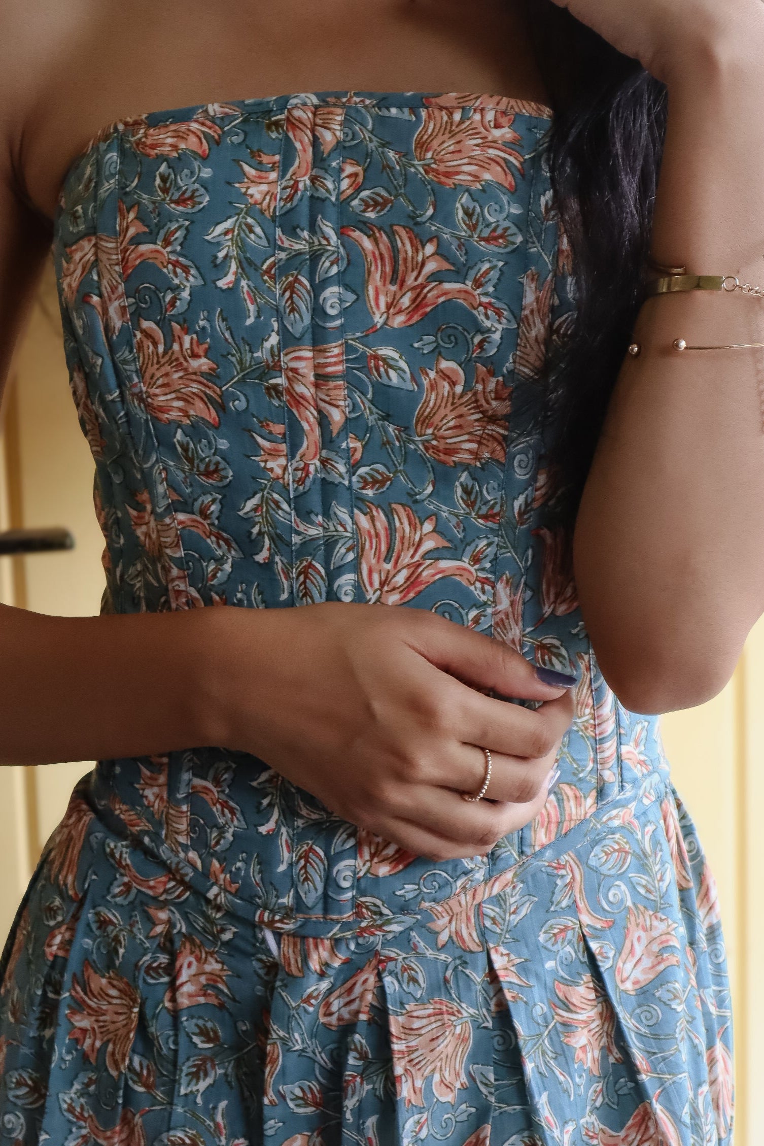 Floral tube corset top crafted in hand block-printed cotton with a bold silhouette, featuring boning for structure and adjustable strings for a perfect fit. Perfect for evening outings or festive gatherings. Style it with high-waisted trousers or a flowy skirt for an elegant, on-trend look.