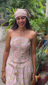 Pink floral tube corset top in hand block printed cotton, featuring hard boning for bold structure and adjustable corset strings for a cinched waist. Perfect for brunches, evening outings, or date nights. Style with high-waist trousers or skirts for a chic, on-trend look.