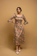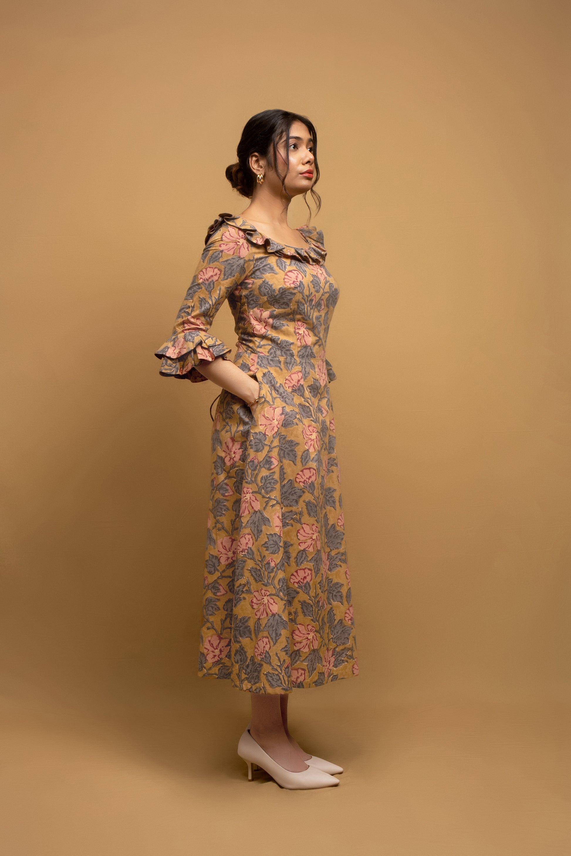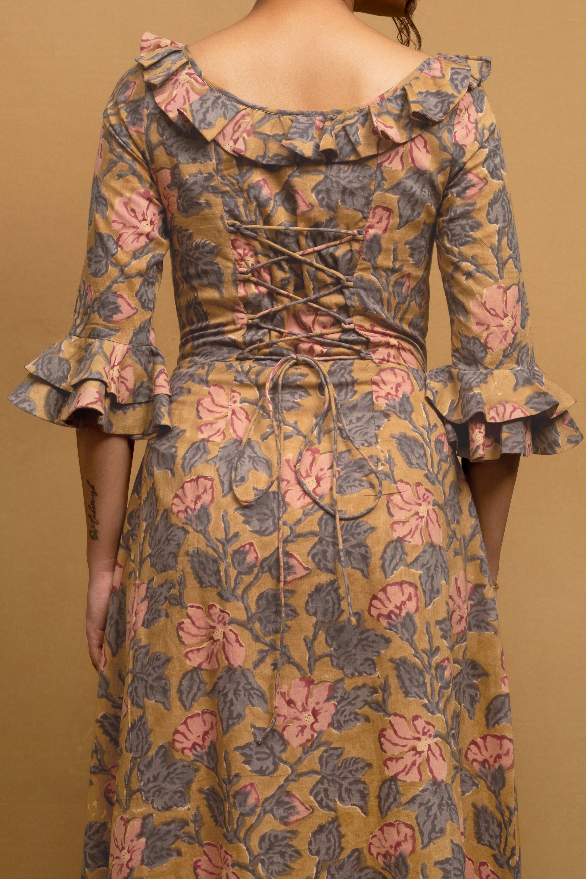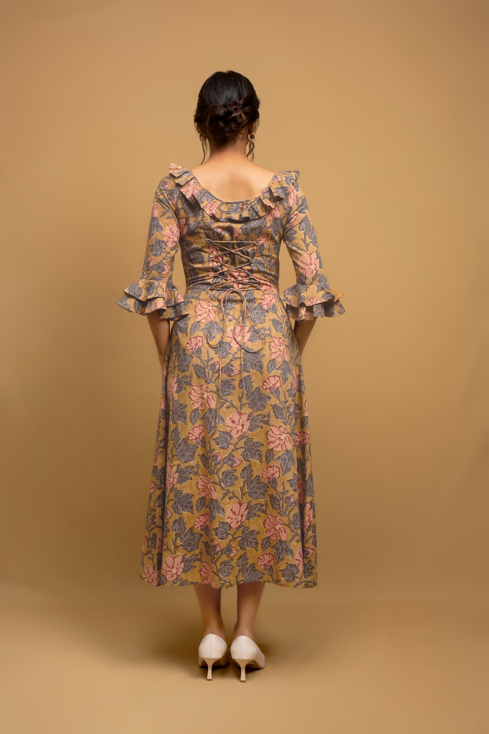 The Jasmine dress is an ode to refined romance and relaxed sophistication. Its gentle ruffled neckline, charming three-quarter sleeves, and stunning hand block printed fabric are perfect for a garden party or a special afternoon. The corset-style lace-up back adds a hint of structured elegance, ensuring you look and feel beautiful from every angle.