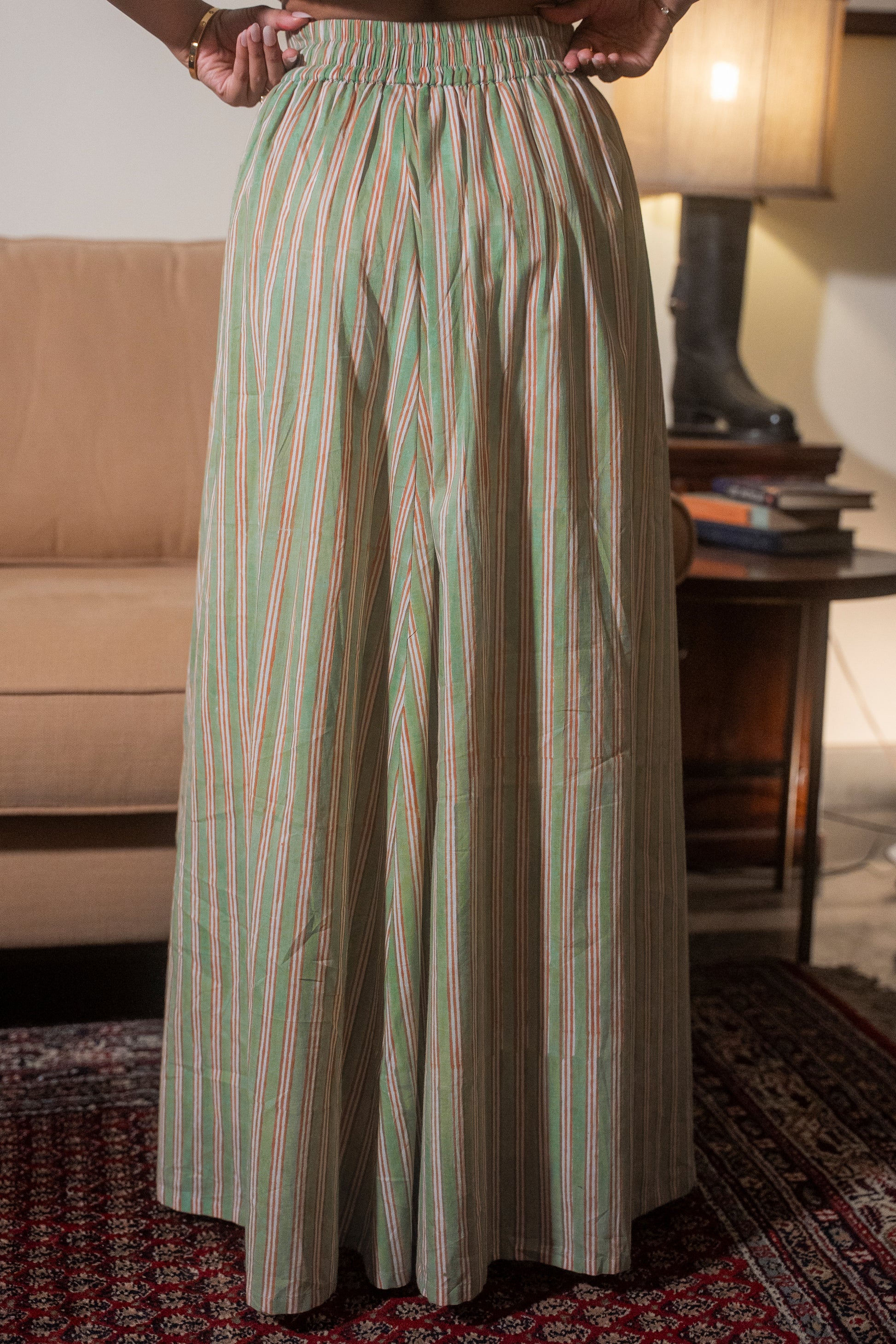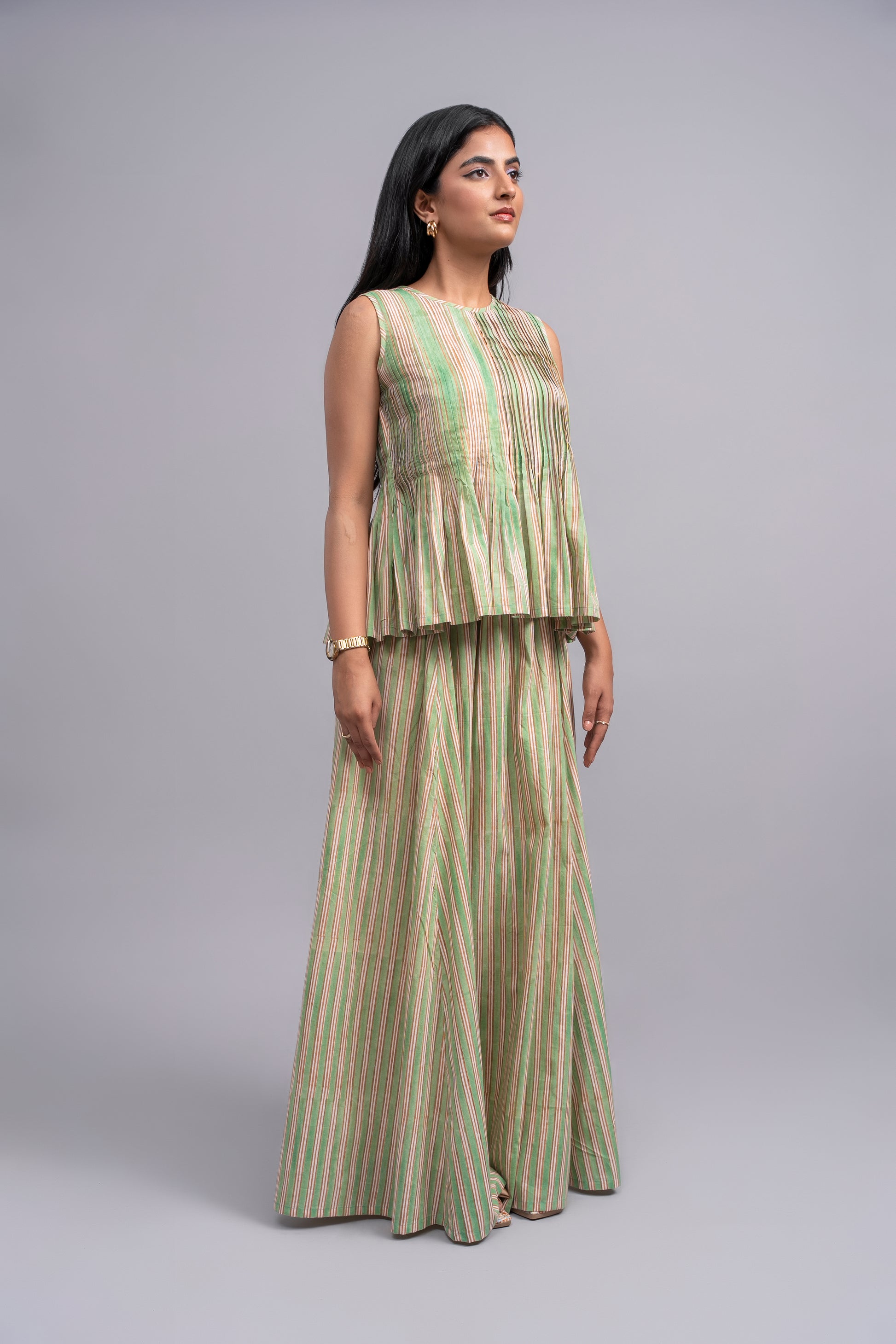This charming Striped Maxi Skirt embodies the gentle grace of our collection, Soft Girl Era. The subtle yet sophisticated vertical stripes in muted green and warm tan lend a delicate touch, while the lightweight cotton fabric promises ultimate comfort. Its flattering, full length makes it perfect for a romantic, everyday aesthetic.