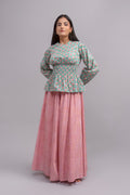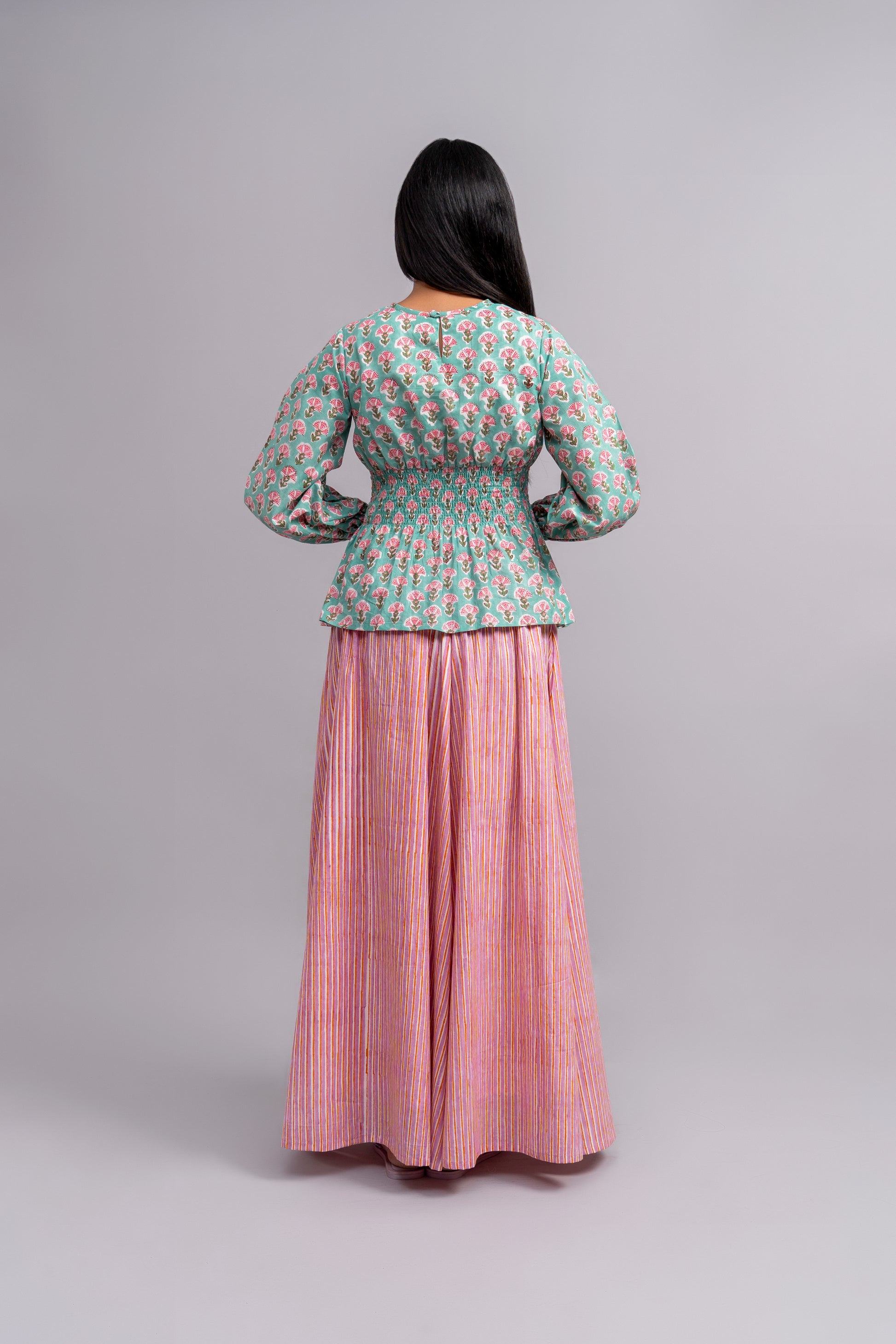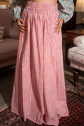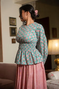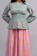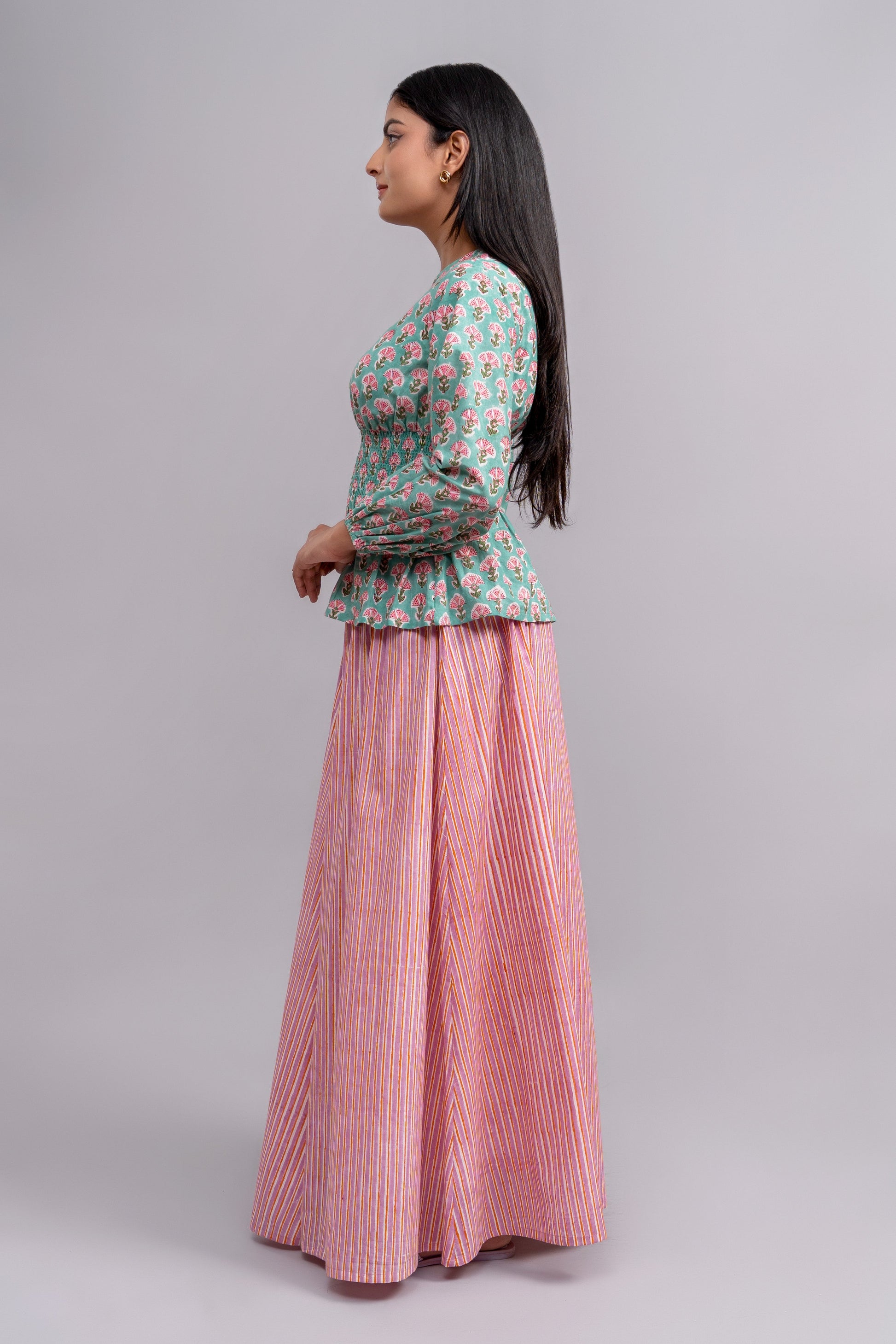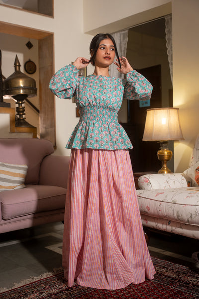 Fresh as a summer's day, the Mixed Berry set brings a beautiful palette to your wardrobe. The intricate block-printed floral butta in soft teal and pink pair beautifully with the delicate stripes of the skirt. This cotton set offers a comfortable, stylish look that's perfect for warm weather and romantic outings.