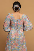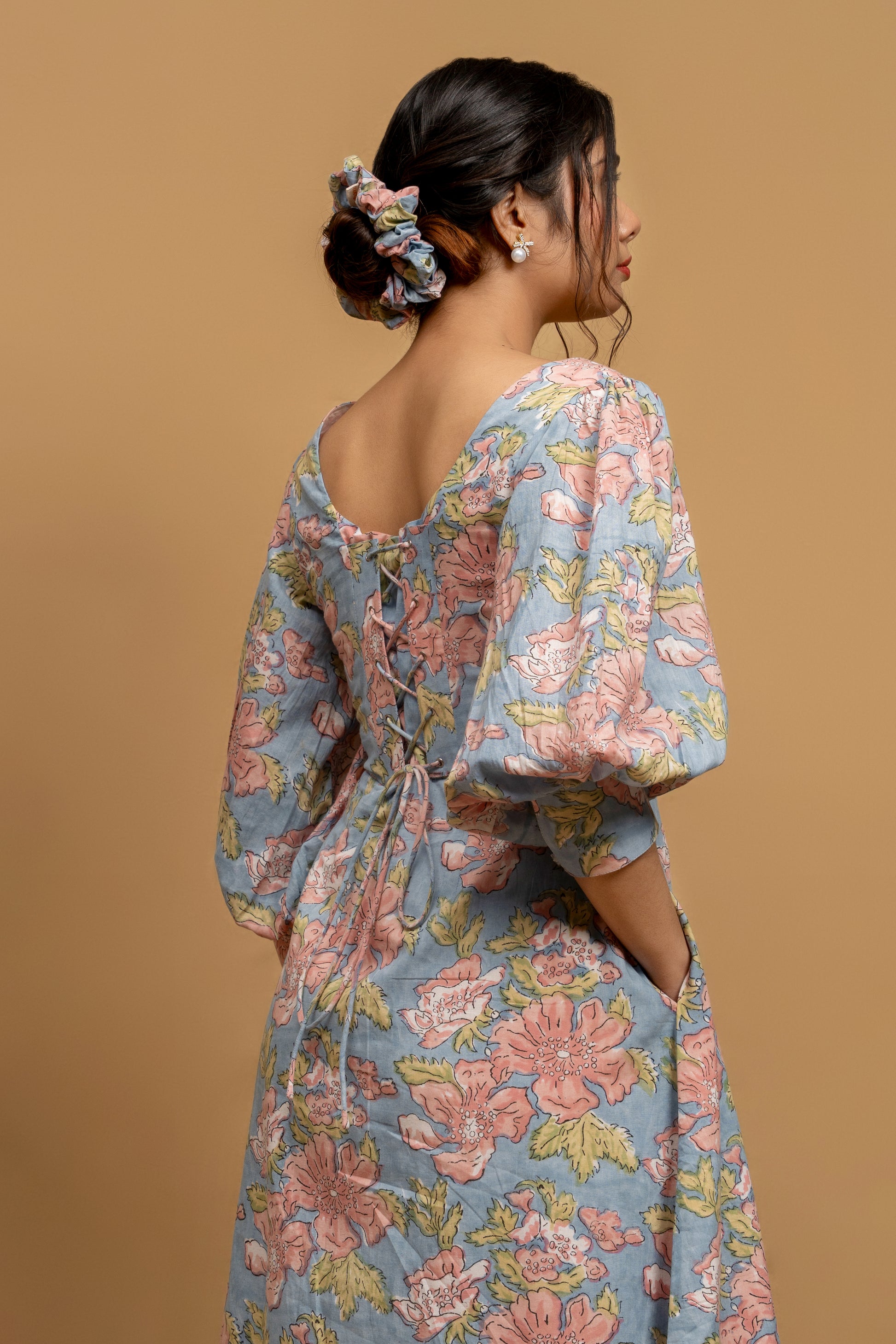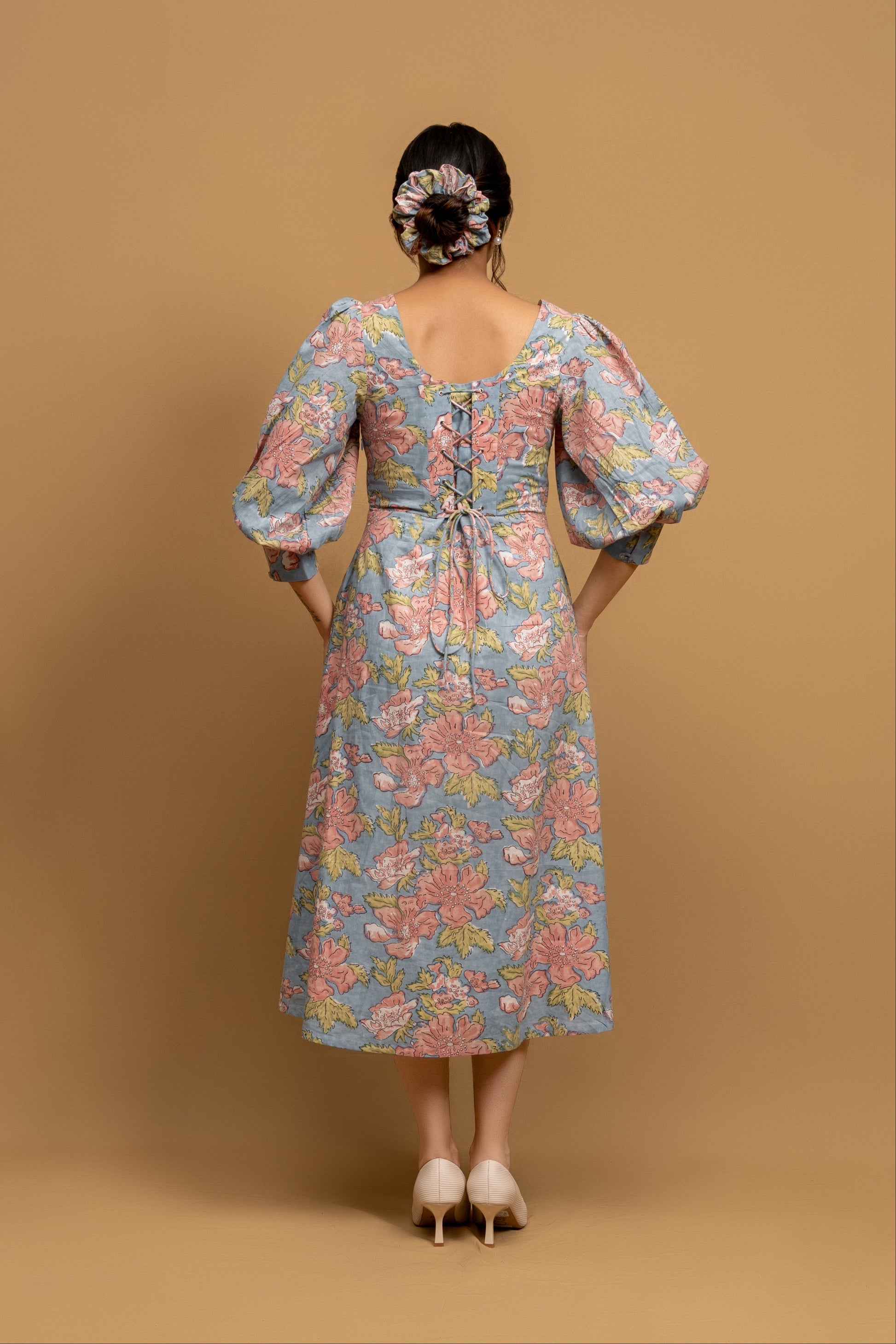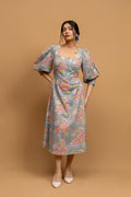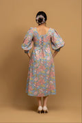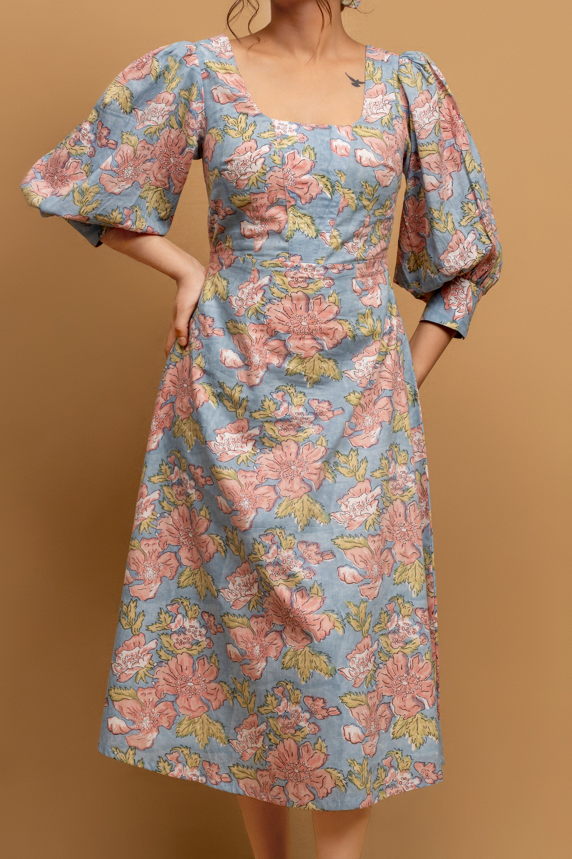 Feel like you've stepped into a blooming garden with the Dahlia dress. This captivating piece from our "Pretty Women Era" collection features a chic Western silhouette, including a flattering U-shape neckline and delicate puff sleeves. Each flower is a testament to the traditional craft of Indian hand block printing, making this dress not just a style statement, but a work of art.