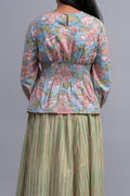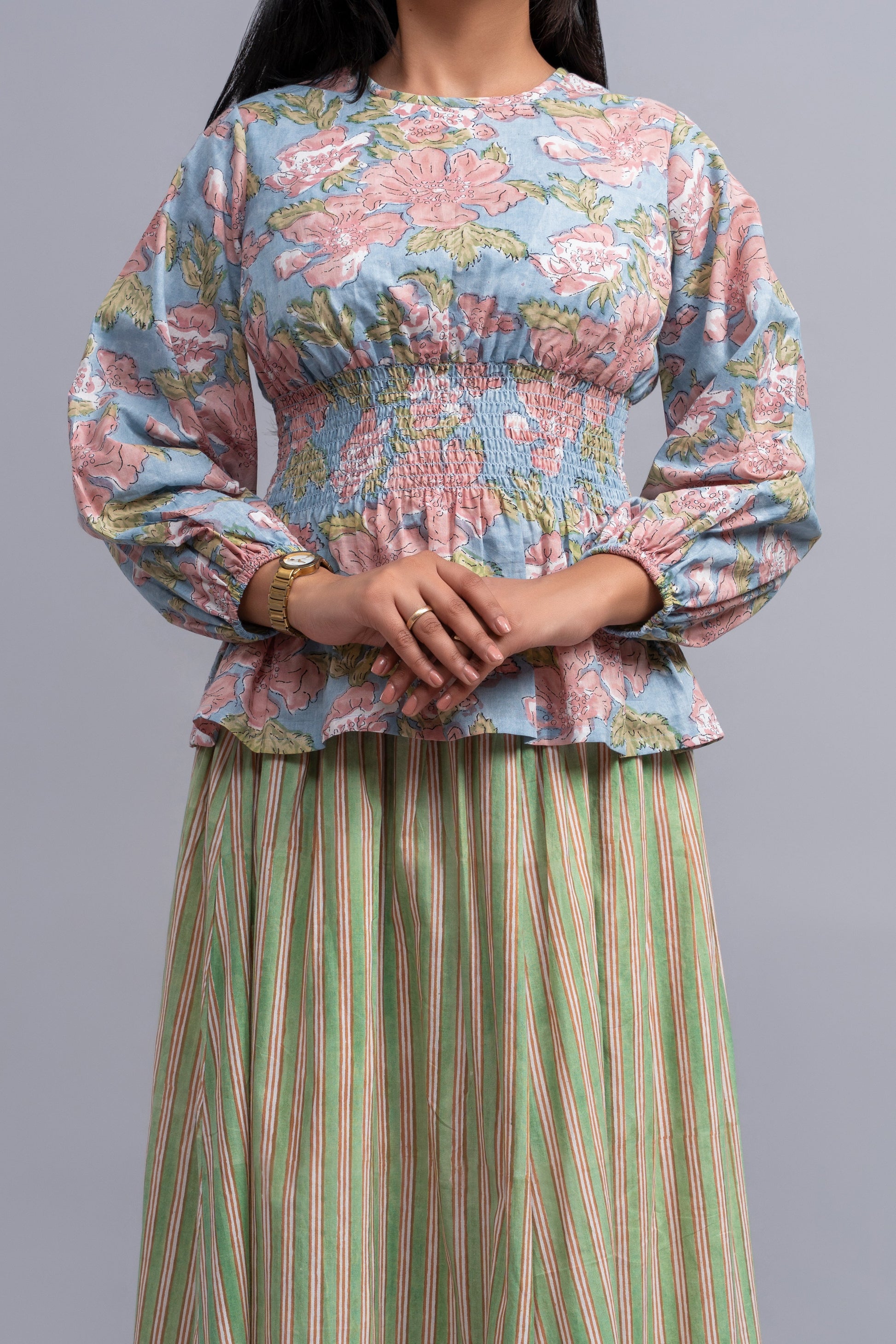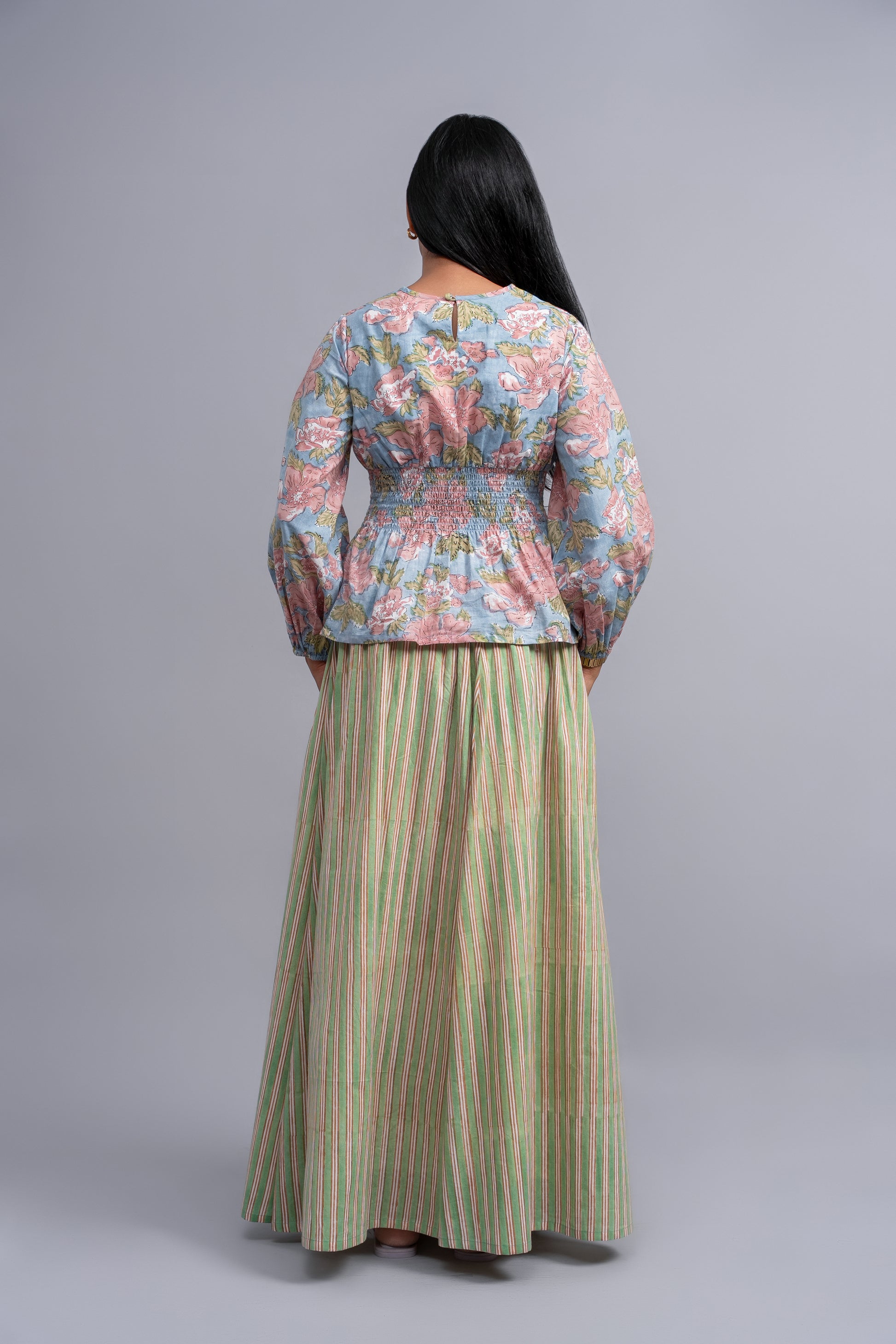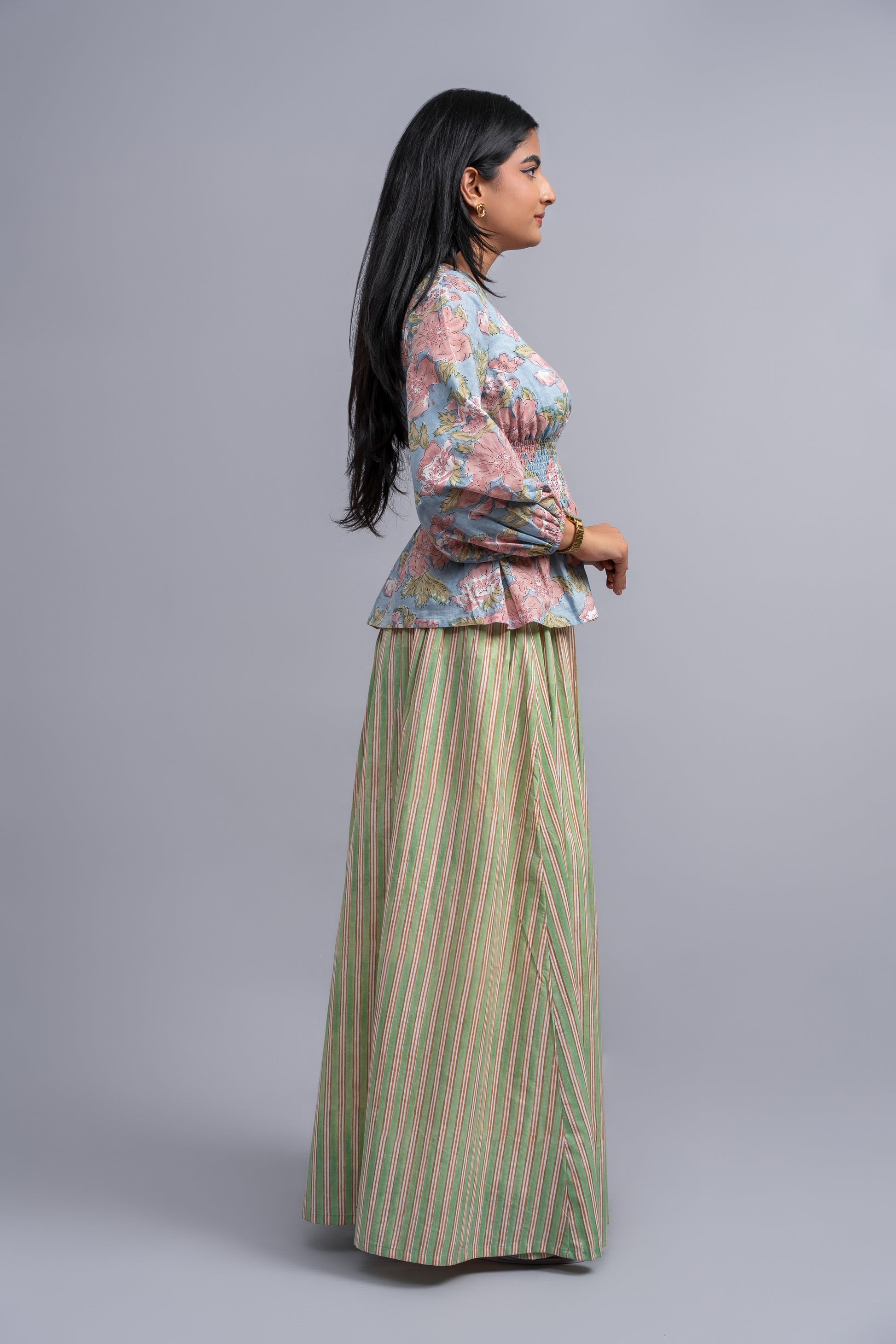 Fresh as a summer's day, the Pine Berry set brings a beautiful palette to your wardrobe. The intricate block-printed florals in powder blue and pink pair beautifully with the delicate stripes of the skirt. This cotton set offers a comfortable, stylish look that's perfect for warm weather and romantic outings.
