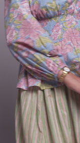 Fresh as a summer's day, the Pine Berry set brings a beautiful palette to your wardrobe. The intricate block-printed florals in powder blue and pink pair beautifully with the delicate stripes of the skirt. This cotton set offers a comfortable, stylish look that's perfect for warm weather and romantic outings.