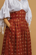 The Violet Corset Skirt is a masterpiece of fusion fashion, inviting you to embrace your inner romantic. Its distinctive corset-style waist not only defines your figure but also adds a touch of old-world grandeur, beautifully contrasted by the traditional Indian hand screen print on the flowing skirt. This skirt is a versatile statement piece, ready to bring a warm, artistic touch to your ensemble.